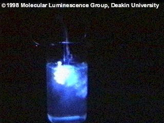 This is the reaction I worked with, I spent a week tweaking the measurements and found these to be optimum with the chemicals I used. A lasting glow of more than 50 seconds can be produced. N.B. If you are using old school supllies, check that your luminol is reasonably fresh. Luminol will go grey over time and I found this to be reasonably useless - it should appear a light olive green colour. Also, the catalyst in this reaction is strongly coloured causing the light to appear green. |